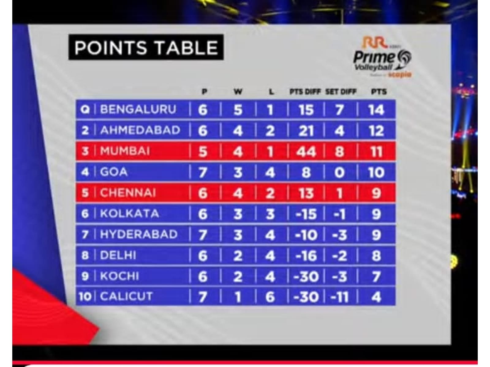Hyderabad attempted to shift momentum by introducing John Joseph, Guru Prashanth, and Paulo Lamounier. Paulo’s vital block on Pankaj electrified the home crowd, while Niyas Abdul Salam rediscovered form and John’s quick block on Rahul earned a crucial super point to help the Hawks clinch the third set and stay alive in the contest.